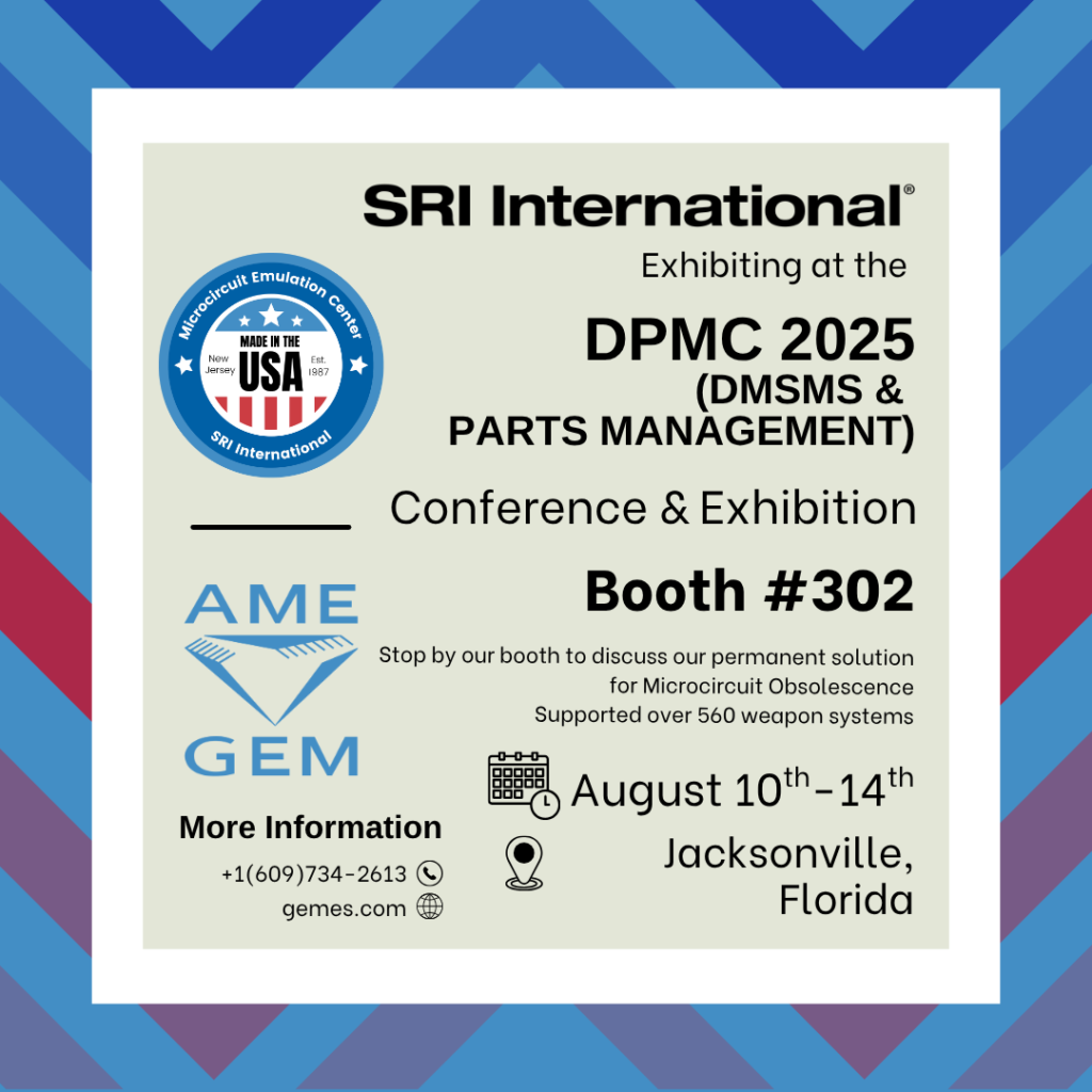 SRI International will be attending the DPMC (DMSMS & Parts Management) 2025 to represent our Emulation Programs. The programs are Defense Logistics Agency (DLA) programs for which SRI International is the prime contractor. The programs have been solving microcircuit obsolescence for nearly 35 years!