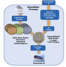 The Emulation programs have developed a split manufacturing process, in which wafer lots are processed through the majority of the manufacturing flow and held in inventory. This technology is based on gate arrays fabricated with predefined circuit elements (base wafers) which are interconnected by multiple levels of metal conductors (wafer personalization) and minimizes the wafer production time for emulated devices. This approach allows Integrated Circuits (ICs) that were originally manufactured in diverse technologies to be produced from a managed inventory of standardized base wafers. An overview of the GEM Production System for emulating microcircuits is illustrated below.