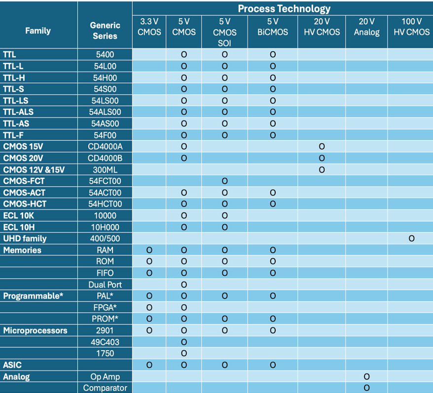 The technologies offered by the Emulation Programs have been expanded over time. The initial focus was TTL (Transistor Transistor Logic) 5-Volt logic families and ECL (Emitter Coupled Logic) devices. Over time new arrays were developed to emulate higher speed and lower power variations of these families. Technologies were also developed to emulate CMOS logic devices with power supplies up to 20-Volts. Smaller node sizes were implemented to emulate more complex ASIC and programmable logic arrays and memory devices. The current technologies can support emulations of user or field programmable devices. Programmable logic or memory devices are emulated using the metal personalization mask during the wafer fabrication. The devices are permanently programmed and verified to be the functional equivalent of the original programmed device.